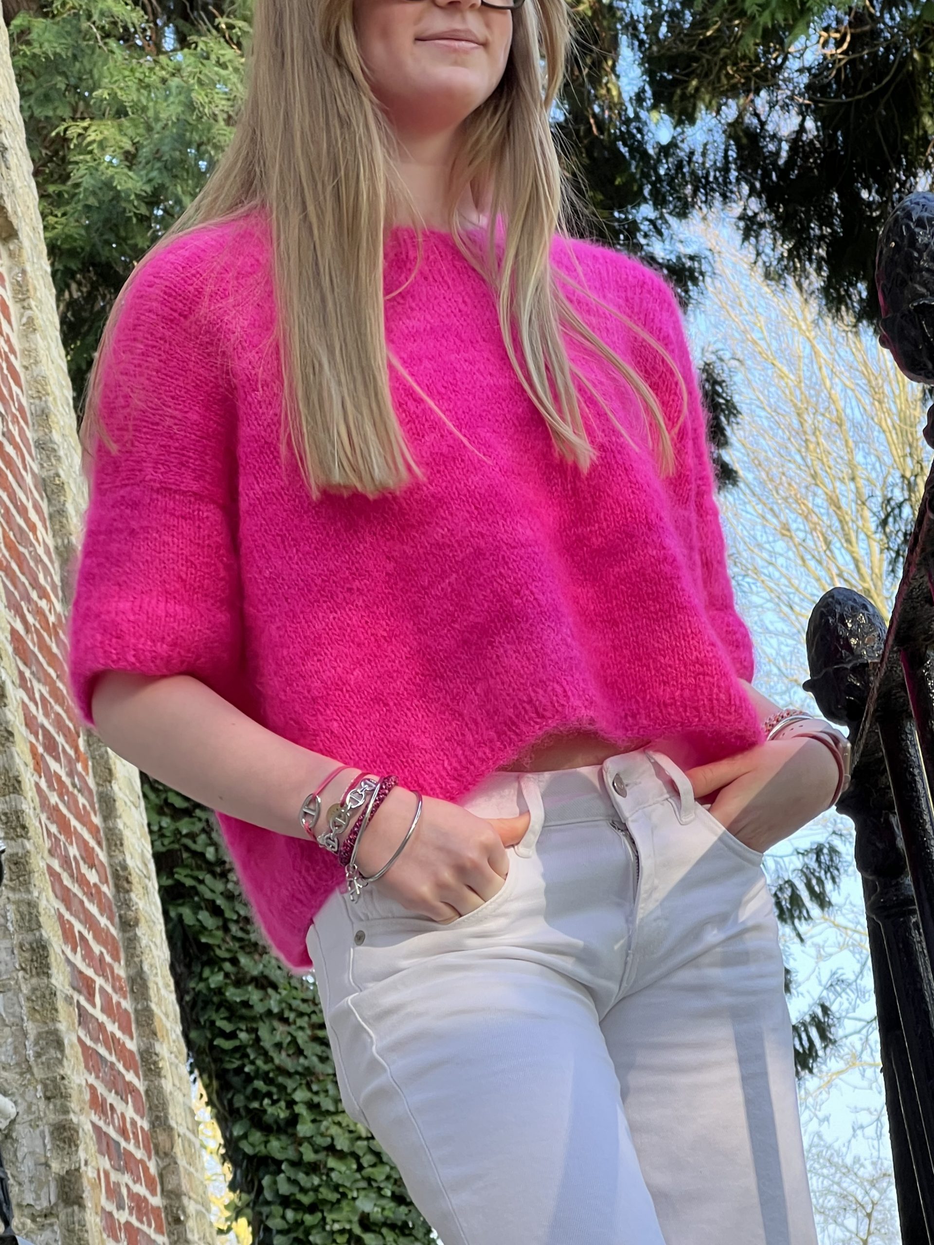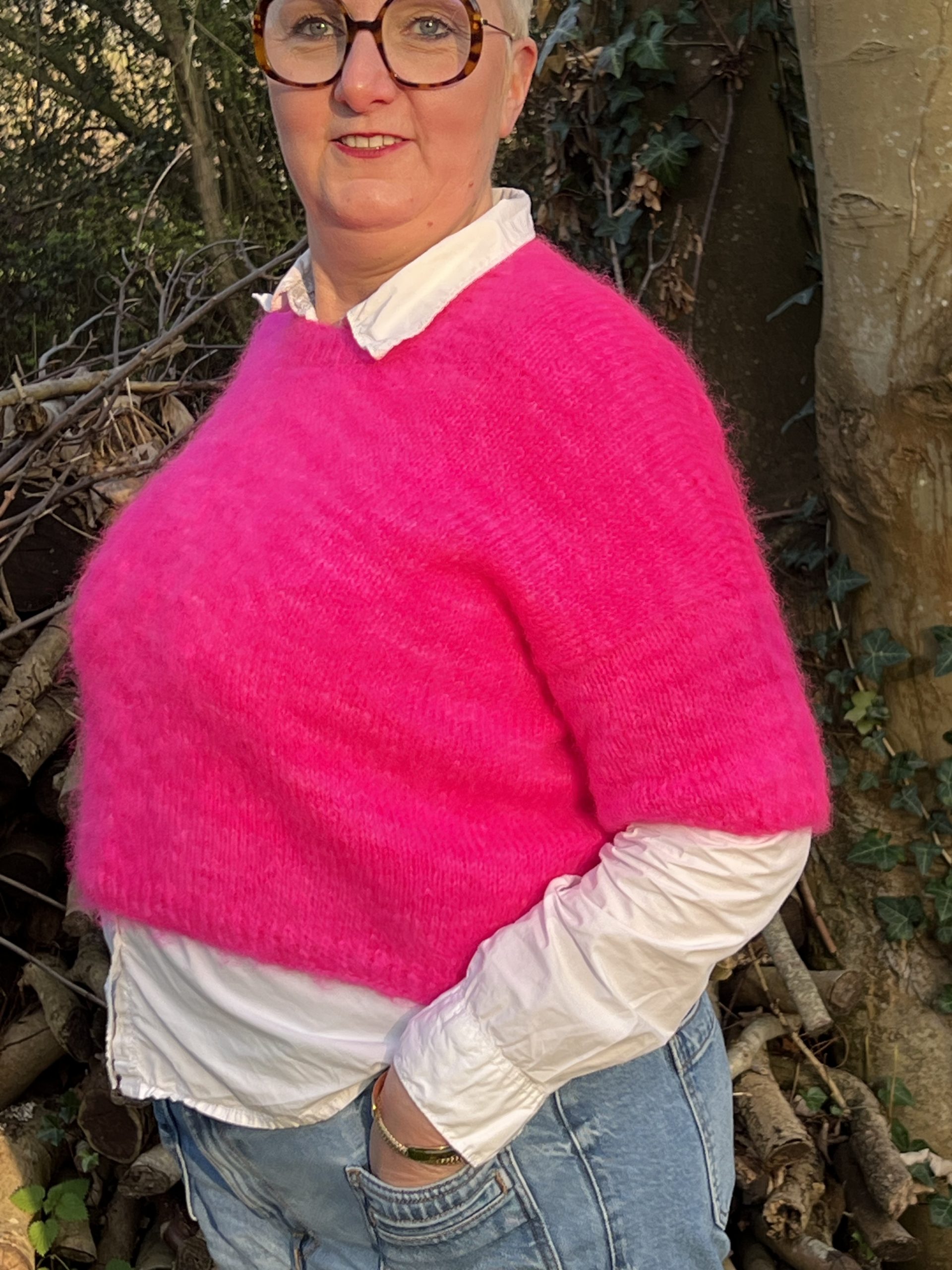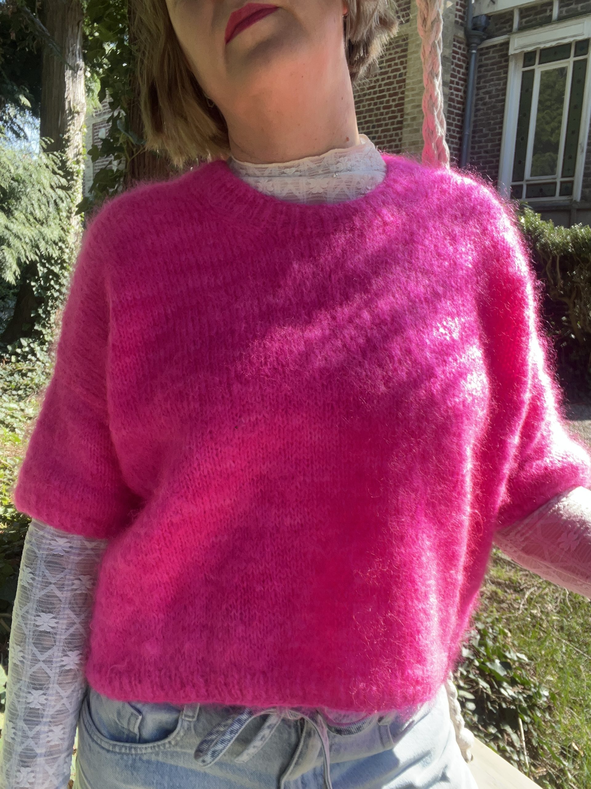 Le pull Miss Harley Quinn, se tricote du haut vers le bas en une seule pièce. Il est doux, aérien et confortable avec un style moderne. Il se tricote avec 3 écheveaux de Tinctura Dk Mohair pour une taille unique avec un tour de poitrine compris entre 84 et 108 cm. Il devient un indispensable cosy et stylé de votre garde-robe et un parfait allié pour les journées fraîches ou superpositions élégantes.